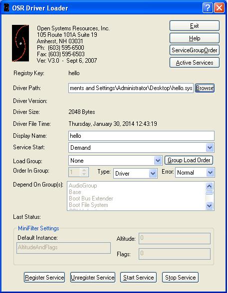 بعد از اینکه درایور ایجاد شد باید لودش کنیم. برای لود کردن درایور راه های مختلفی وجود دارد، یک راه استفاده از ابزارهای آماده برای این منظور است که من یک نمونه آن را در این آموزش آورده ام به نام OSRLoader و راه دیگر استفاده از API هایی است که ماکروسافت در ویندوز قرار داده تا با آنها بتوان یک درایور را لود کرد (البته راه هایی دیگر و غیر مستند دیگری وجود دارد که فعلا به آن اشاره نمیکنم). مسلما اگر پروژه ای داشته باشید و بخواهید با برنامه نویسی درایوری لود کنید باید از API های ویندوز استفاده کنید. داخل نمونه سورس هایی که همراه WDK است نمونه کد برای این منظور زیاد است. من اینجا نحوه استفاده از OSRLoader را میگویم. در زیر تصویری از محیط این ابزار را می توانید مشاهده کنید