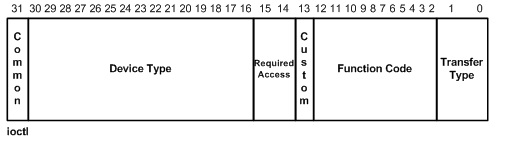 تا الان باید بدانید ioctl چیست. یک کد که در واقع یک عدد است و ما در سمت سطح کاربر می خواهیم بسازیم و از طریق آن به درایور خود بگوییم فلان کار را انجام بدهد. ساختاری که این کد ۳۲ بیتی دارد در شکل زیر نمایش داده شده است.