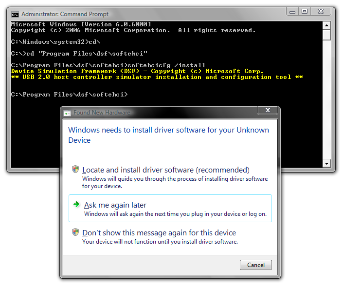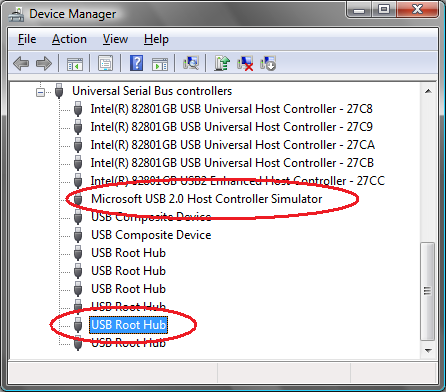 این دستور باعث ایجاد یک USB Controller مجازی در device tree (رجوع به آموزش در مورد device stack) می شود. که می توانید در Device Manager آن را ببینید. سیستم ممکن است از شما برای این دستگاه جدید درخواست درایور کند در این صورت مسیر C:\Windows را به آن بدهید. بعد از اینکه درایورها به درستی نصب شوند شما باید در Device Manager دو دستگاه جدید به نام های Microsoft USB 2.0 EHCI Host Controller Simulator و USB Root Hub را مانند شکل زیر ببینید.
