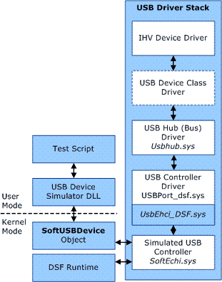 حالا چگونه این فرم ورک می تواند دستگاه USB را شبیه سازی کند بدون آنکه آن را بشناسد؟ در واقع این فرم ورک تمام ارتباطات انجام گرفته را به یک برنامه سطح کاربر انتقال می دهم که این برنامه سطح کاربر می تواند به هر زبانی که از COM (Component Object Model) پشتیبانی می کند نوشته شود. به این صورت می توانید رفتار دستگاه شبیه سازی شده را کنترل کنید. در تصویر زیر ارتباط بین بخش های مختلف قابل مشاهده است. (عکس برگرفته از MSDN)