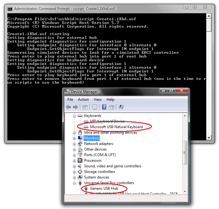 یکسری مراحل است که باید دنبال کنید. اگر برای اولین بار است که این کار را انجام می دهید ویندوز ممکن است سوالی در مورد نصب درایورهای دستگاه های جدید از شما بپرسد. این اسکریپت این دو دستگاه با نام های Generic USB Hub و USB Microsoft Natural Keyboard را می سازد که که در تصویر پایین قابل مشاهده است